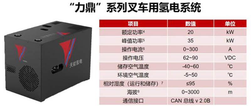 此次天能氫能源與徐工特機合作打造的適用于叉車專用的“力鼎”燃料電池系統(tǒng),額定輸出20kW,峰值輸出可達35kW,燃料電池電堆設計壽命可達10000h,兼容市面上大部分鉛酸或鋰電電動叉車。產品在徐工叉車上進行配置應用后呈現“體積小,零碳排,加氫3分鐘、工作5小時”的特點,有效解決了新能源叉車產品的續(xù)航問題。